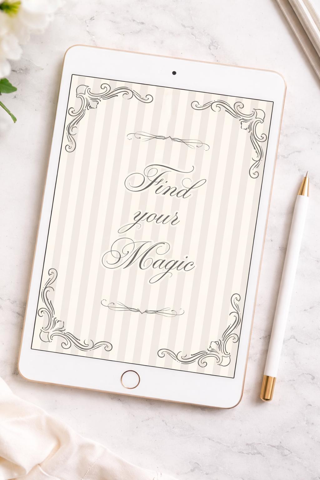 An illustrated "Find your Magic" Coquette-style digital poster, designed for easy personalization and effortless sharing via email or WhatsApp. You can edit the text to reflect your words, while the illustrations remain fixed to preserve the original artwork.